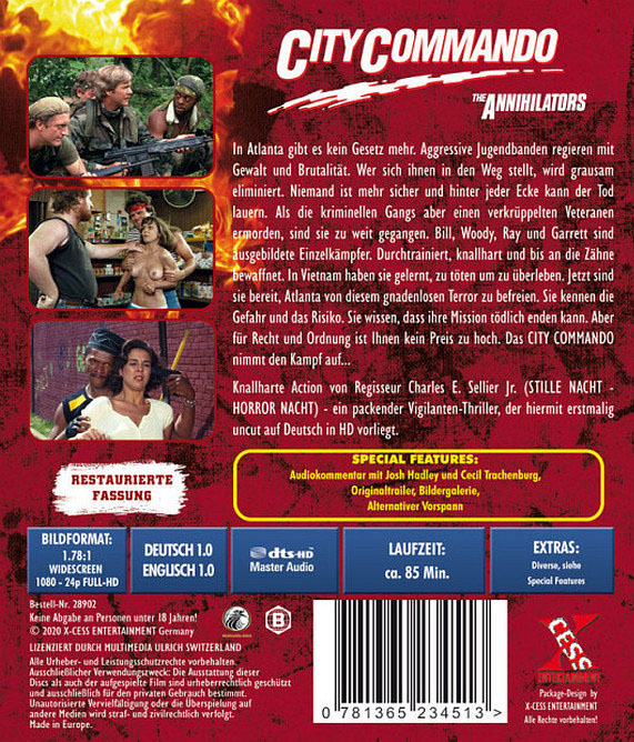In Atlanta gibt es kein Gesetz mehr. Aggressive Jugendbanden regieren mit Gewalt und Brutalität. Wer sich ihnen in den Weg stellt, wird grausam eliminiert. Niemand ist mehr sicher und hinter jeder Ecke kann der Tod lauern. Als die kriminellen Gangs aber einen verkrüppelten Veteranen ermorden, sind sie zu weit gegangen. Bill, Woody, Ray und Garrett sind ausgebildete Einzelkämpfer. Durchtrainiert, knallhart und bis an die Zähne bewaffnet. In Vietnam haben sie gelernt, zu töten um zu überleben. Jetzt sind sie bereit, Atlanta von diesem gnadenlosen Terror zu befreien. Sie kennen die Gefahr und das Risiko. Sie wissen, dass ihre Mission tödlich enden kann. Aber für Recht und Ordnung ist Ihnen kein Preis zu hoch. Das CITY COMMANDO nimmt den Kampf auf…