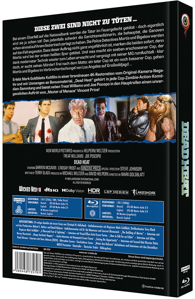 Erlebt Mark Goldblatts Kultfilm in einer brandneuen 4K-Restoration vom Original-Kamera-Negativ und mit Unmengen an Bonusmaterial. „Dead Heat“ gehört in jede Cop-Zombie-Action-Komödien- Sammlung und bietet neben Treat Williams und Joe Piscopo in den Hauptrollen einen unvergesslichen Auftritt vom „Master of Menace“ Vincent Price!