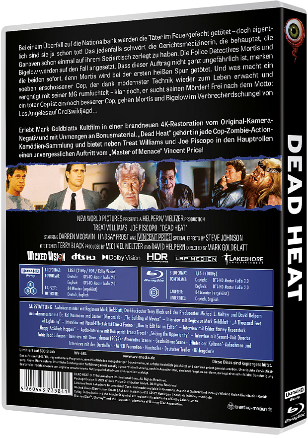 Erlebt Mark Goldblatts Kultfilm in einer brandneuen 4K-Restoration vom Original-Kamera-Negativ und mit Unmengen an Bonusmaterial. „Dead Heat“ gehört in jede Cop-Zombie-Action-Komödien- Sammlung und bietet neben Treat Williams und Joe Piscopo in den Hauptrollen einen unvergesslichen Auftritt vom „Master of Menace“ Vincent Price!