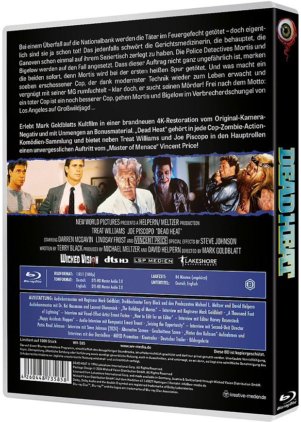 Erlebt Mark Goldblatts Kultfilm in einer brandneuen 4K-Restoration vom Original-Kamera-Negativ und mit Unmengen an Bonusmaterial. „Dead Heat“ gehört in jede Cop-Zombie-Action-Komödien- Sammlung und bietet neben Treat Williams und Joe Piscopo in den Hauptrollen einen unvergesslichen Auftritt vom „Master of Menace“ Vincent Price!